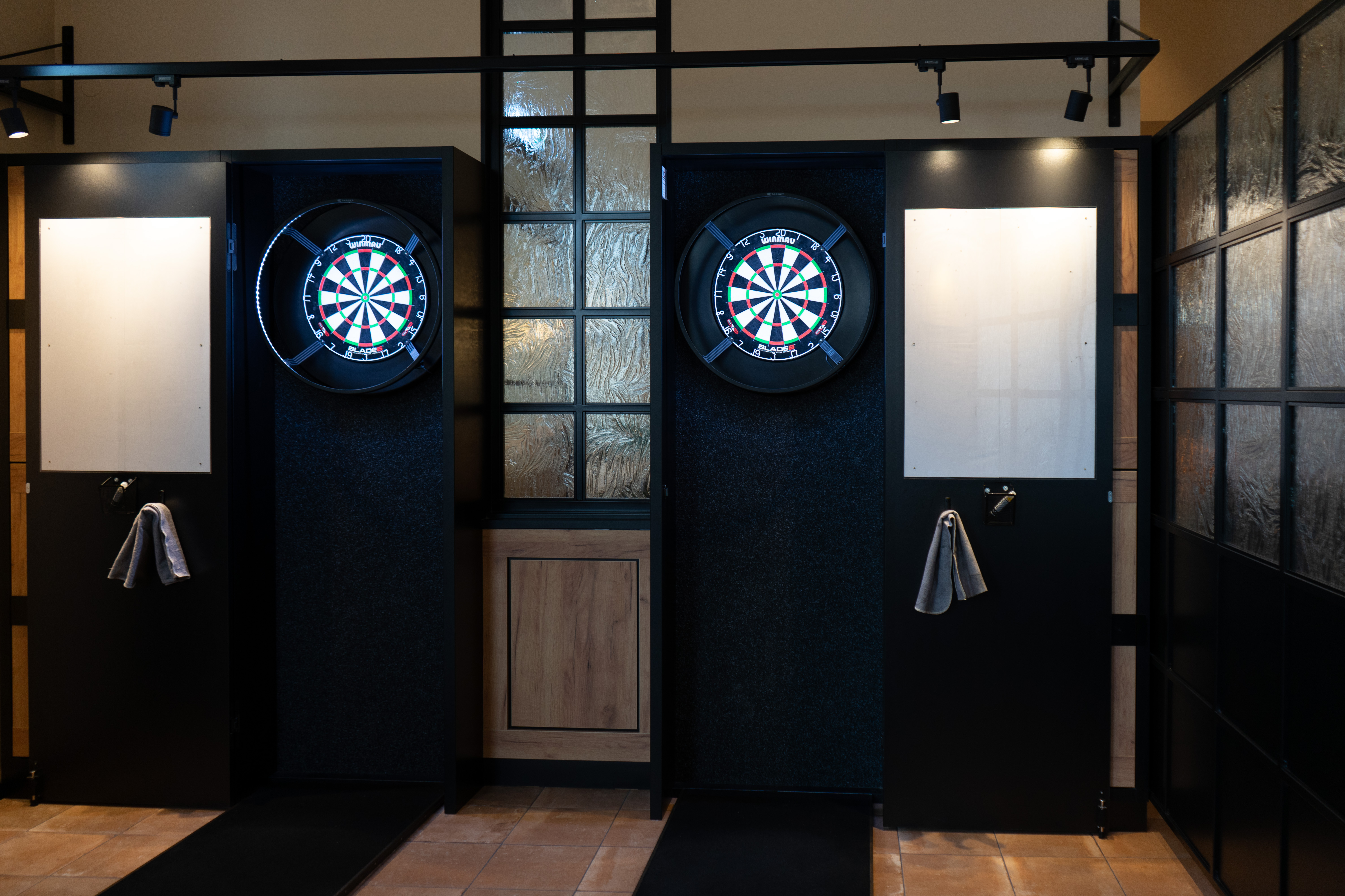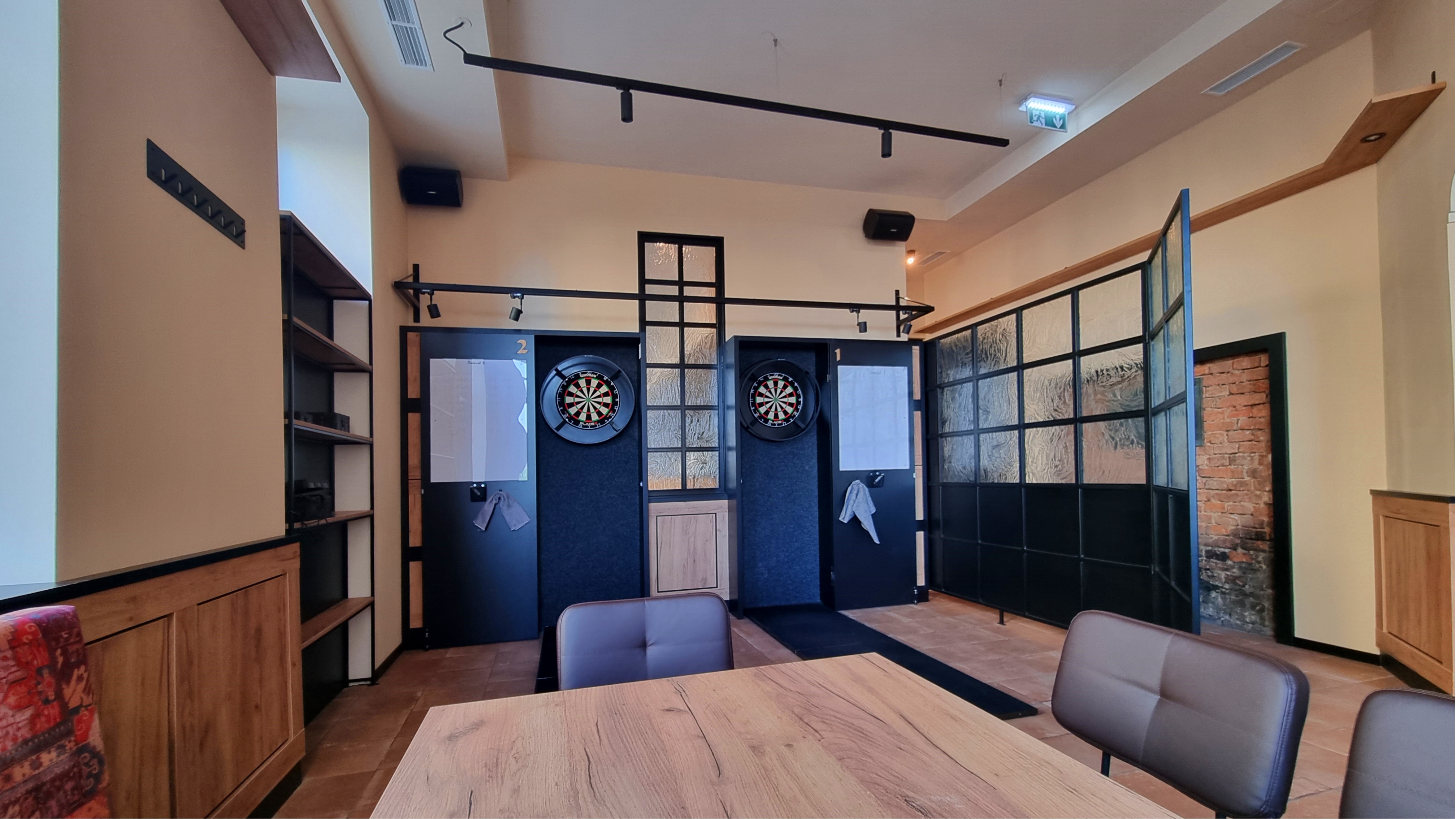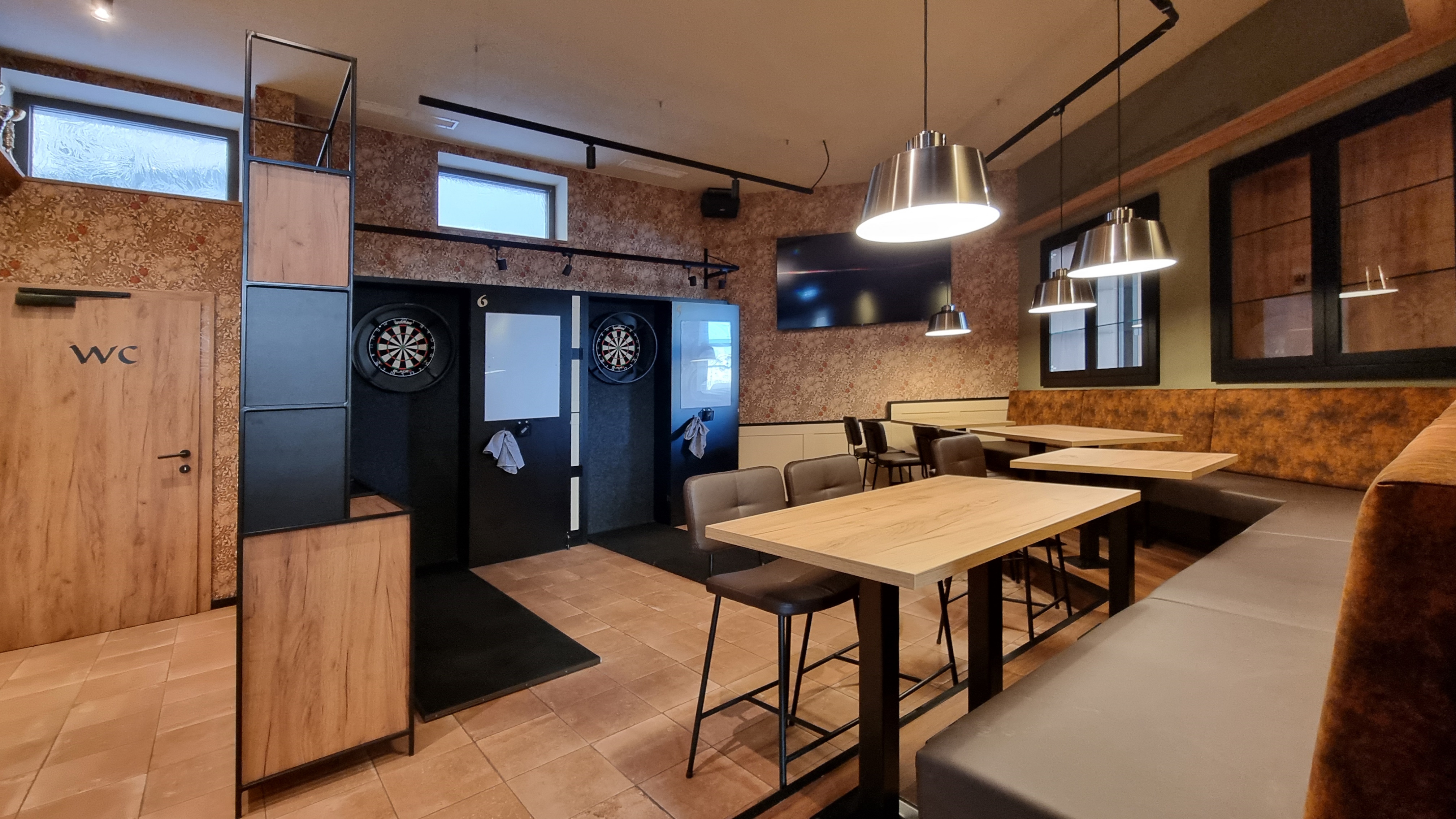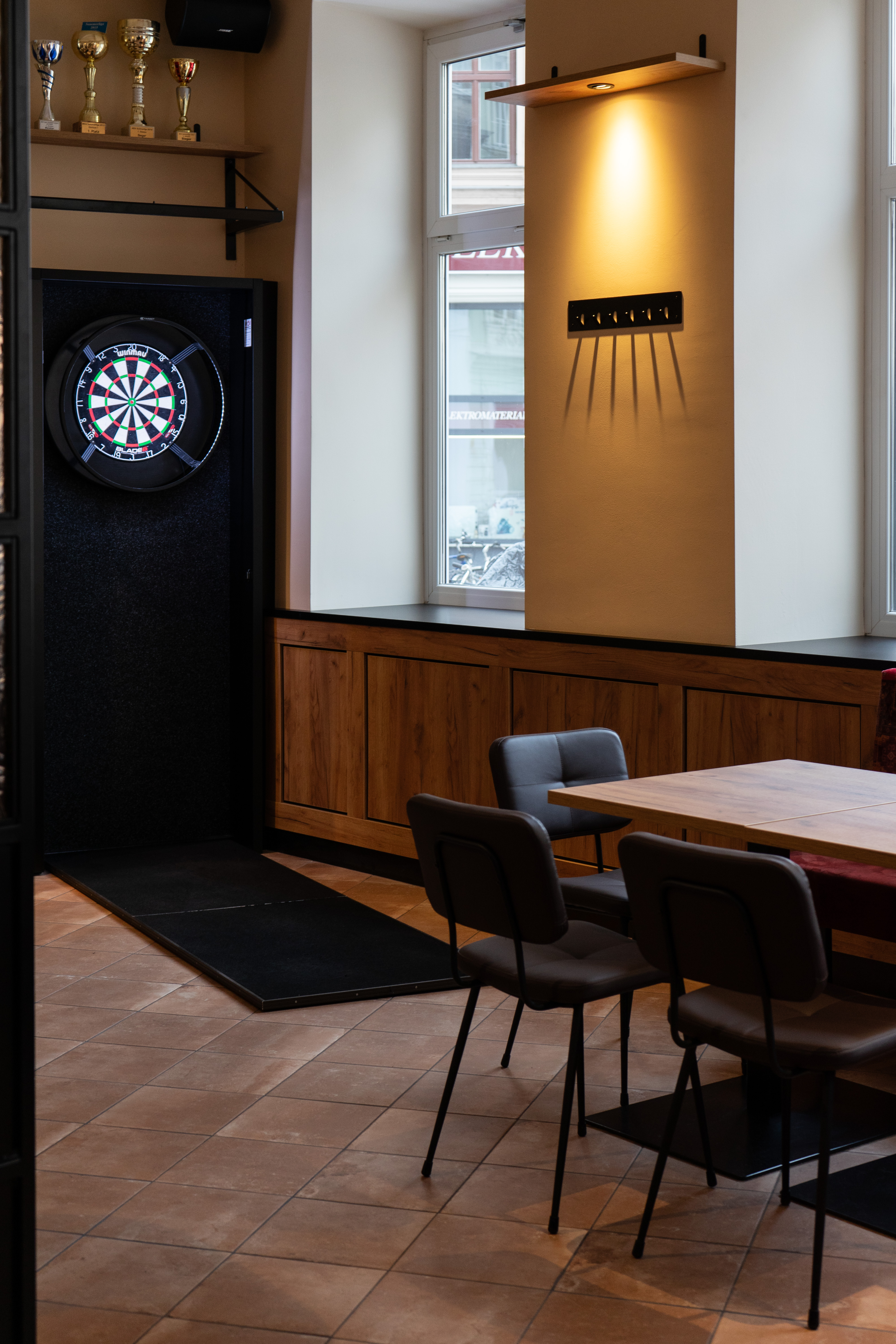 Trotz sportlichem Fokus bleibt der Charakter der Dartbar erhalten: gemütliche Sitzecken, warme Farben und authentisches Ambiente. Farb- und Materialkontraste, klare Linien und gut zonierte Bereiche schaffen Raum für verschiedene Stimmungen – vom entspannten Guinness-Abend bis zur sportlichen Spielrunde. Eine moderne Bar, ohne dass Gemütlichkeit zu kurz kommt.