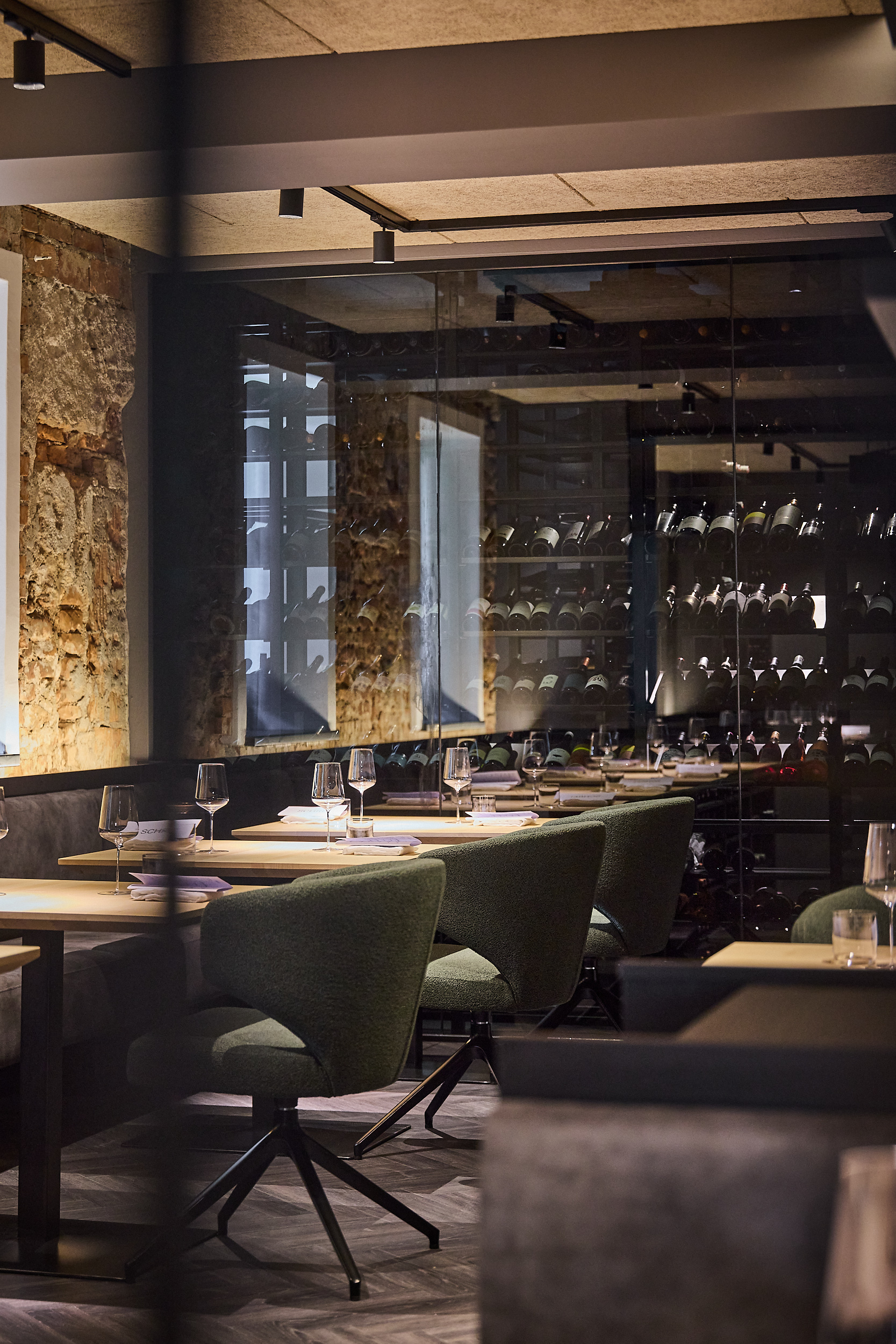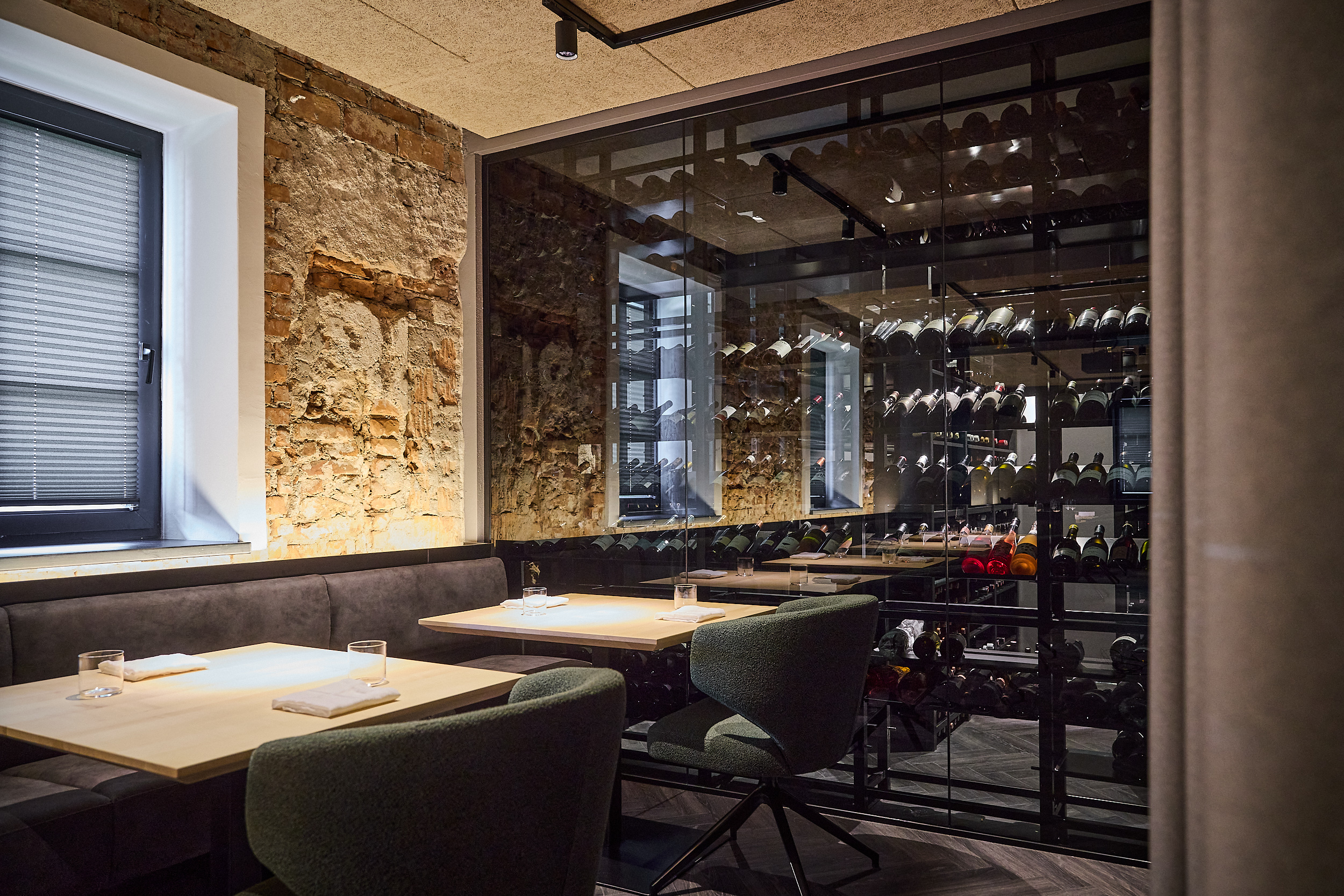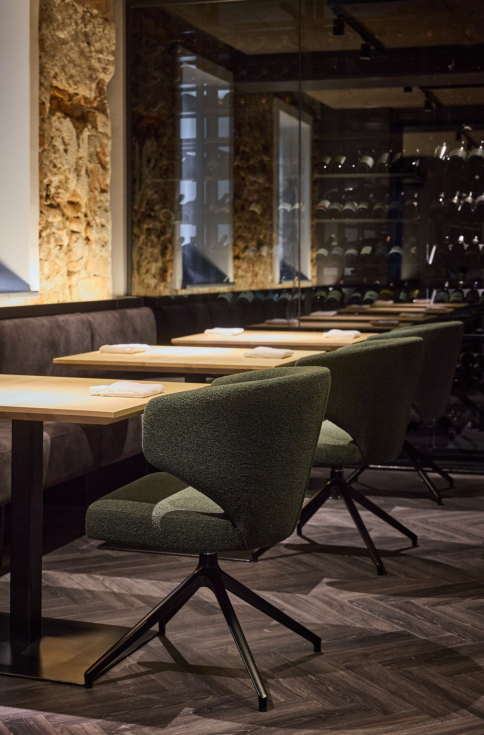 Das Restaurant vereint zeitloses Design mit feiner Gastlichkeit. Weiche Stoffe, natürliche Materialien und sanftes Licht schaffen einen Rahmen, in dem jeder Moment besondere Bedeutung erhält. Durch die Glaswand schimmert der erlesene Weinkeller – ein Versprechen für die perfekte Begleitung zu jedem Gang.